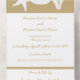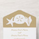 Bring touch of summer fun to your event with this all-in-one wedding invitation and RSVP card. On the inside you will find the white silhouettes of a starfish, sand dollar, and conch seashell on a sandy tan background above a section with some sample text that can be customised for your special day. The lower section of the invite features a removable, postcard sized piece that has some sample RSVP text sitting above a sand border with a pattern of seashells, starfish, and sand dollars scattered across the bottom. Outside, a similar border of seashells on tan can be found below the areas where you would add stamps, standard, and return addresses for both the invitation as a whole and the returnable RSVP section. The flap used to fold over and seal the card has the starfish, sand dollar, and conch shell on a sand background with a sample set of initials that you can customise for a final personal touch and to cinch the summer beach feel. Be sure to check out the rest of the Summer Seashells in Sand set for other coordinating products, including return address labels.