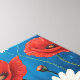 This vibrant painting captures the joyful essence of a summer meadow. Bold red poppy blossoms, with their delicate, crinkled petals and dark centres, stand proudly amidst a field of cheerful white daisies with sunny yellow hearts. Wispy blades of grass and unopened poppy buds add depth and texture to the scene. The background is a serene blend of blues, suggesting a bright summer sky. The artist's brushstrokes create a sense of gentle movement, as if a light breeze is rustling through the flowers.
