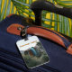 Beautiful luggage tag with leather strap and built in card for identification details, featuring Summer Suite Surfboards & Palm Trees design - inspired by our song Summer Suite.