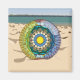 This beach themed mandala features layers of seashells, sailboats, sand, sun, sea, and palm trees inside of a transparent beach ball that is sitting on a sandy beach with the ocean on the horizon to bring to mind the fun that comes with summer.