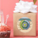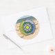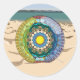 This beach themed mandala features layers of seashells, sailboats, sand, sun, sea, and palm trees inside of a transparent beach ball that is sitting on a sandy beach with the ocean visible in the distance to bring to mind the fun that comes with summer.