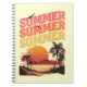 Retro style grunge illustration with yellow, pink and orange "Summer, summer, summer" text design and beach scene with sunset at the mountains with palm trees