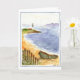 This fun watercolor is of a beach scene with its row boat and lighthouse in the background with sailboats sailing the blue sea.