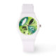 Summer Time Theme Watches for Women that features a summer green and aqua background with a white and black silhouettes of Palm trees and Surfboards. The surfboards have splashes of blue water around them. Great gift for anyone who loves Summer. Many styles to choose from! Watch Numbers can be deleted if you prefer your watch without them.