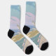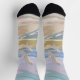 Transport yourself to the serene coastal bliss of a summer's day with this art print socks, capturing the essence of a tranquil beach scene. The soft pastel hues of blue, pink, purple, tan and creams, evoke the calming aura of a coastal sunset or sunrise, where the ocean's gentle surf kisses the shore. As seagulls dance in the warm summer breeze, this print encapsulates the essence of a relaxing day by the beach.