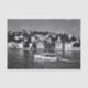 View of a small wooden fishing boat on Bosphorus. Historical, old Turkish / Ottoman houses on Asian side of Istanbul are in the background. It is a sunny summer day. Black and white photography.