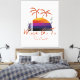 Retro style design features "wanna go to the beach" text with tropical sunset and female surfer silhouette graphics