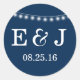 Modern Summer Wedding String Lights Blue round sticker with simple yet elegant glowing white string lights hanging across the top with a stylish mix of modern typography on a summer night dark blue background. A simple and trendy, preppy design, perfect for summer! Click the "CUSTOMIZE IT" button to customise fonts, move text around,change the background colour and create your own unique one-of-a-kind wedding sticker design.