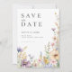 Elegant floral wedding save the date featuring watercolor wildflower border and modern minimal typography design.