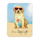 It’s a dog’s life! Be cool and celebrate the dog days of summer with this cute yellow Labrador Retriever puppy wearing sunglasses and relaxing with a drink.