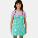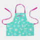 Kids apron in tropical blue-green and bright pink. This kitchen, or gardening, apron has a template for her name in magenta pink. Straps match the pink colour. An allover print that includes palm trees, sunglasses, sea stars, flip flops, and seashells in a summer pattern. Also comes in adult sizes.