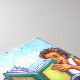 Summertime Reading Art by Traci Van Wagoner features a boy and a girl sitting in an urban backyard on a hot summer day with their feet in a cool tub, drinking lemonade, and reading books. A cat and a dog lay curled at their feet on the wood deck. Perfect for book lovers and bibliophiles of all ages.