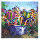 Summertime Reading Art by Traci Van Wagoner features a boy and a girl sitting in an urban backyard on a hot summer day with their feet in a cool tub, drinking lemonade, and reading books. A cat and a dog lay curled at their feet on the wood deck. Perfect for book lovers and bibliophiles of all ages.