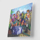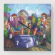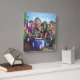 Summertime Reading Art by Traci Van Wagoner features a boy and a girl sitting in an urban backyard on a hot summer day with their feet in a cool tub, drinking lemonade, and reading books. A cat and a dog lay curled at their feet on the wood deck. Perfect for book lovers and bibliophiles of all ages.