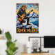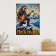 This exhilarating artwork features a lion, sporting cool sunglasses and a leather jacket, intensely playing an electric guitar atop a snow-covered mountain peak. A vast, icy landscape with a blue lake and distant peaks stretches out below a partly cloudy sky. The painting's thick, textured brushstrokes give a raw, energetic feel to the snowy terrain, powerfully conveying the "Rock or Die" spirit of this unique high-altitude performance.