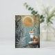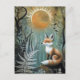 This illustration shows a red fox sitting peacefully in a lush, magical forest. The fox is surrounded by a variety of detailed plants and ferns, with a glowing sun illuminating the scene from the background. The shadows of leaves play across the sun's surface. The overall atmosphere is serene and enchanting, blending natural elements with a touch of fantasy.