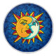 A sun and moon face in the Mexican tile style, in bright orange, yellow and blue with black accents.