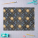 This celestial design showcases yellow suns and blue-grey moons in a diamond pattern on a black/dark-grey background. Perfect for decoupage art, gift wrapping, or paper crafts.