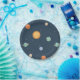 Space themed party supplies with doodles of the sun and planets over a dark blue backdrop decorated with little stars. Keep a look out for planet Earth that has clouds as eye brows. Colourful and cheerful pattern.