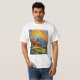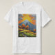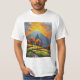This is an image of a painting, this is a creation of mine with image generator, shows the sun setting up behind the mountain at the same time that it's raining, red trees with green landscapes and the contrast of the cloud colors with the mountain and landscape, the T-shirt is of excellent quality ideal for presenting a person.