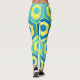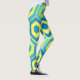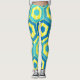 These leggings have a geometric design of hexagons in four shades of blue on a field of yellow stripes in two shades.