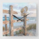 A woman's sun hat with a bow and ribbon hangs on a weathered fence post in the breeze at the beach, with an ocean surf in the background.