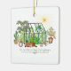 Square ornament has plants and greenhouse design on one side and says "it's not hoarding if it's plants" and a classic sun face with "Let the sunshine in." Designs by Rhonda Stewart.