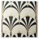 Art Deco striped pattern with black and white semicircles emulating a fan shape and gold border accents with sun rays and flanked by a gold decorative border.