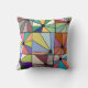 This throw pillow has an abstract design that is made of nine squares with a circle and “rays” coming out of the circle in many different colours.