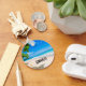 A keychain with a lovely photograph. A white sandy beach with azure blue water. Relaxing image with a sunny sky and gentle foamy surf with some cute tropical leaves framing the image.
