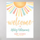 Welcome guests to your baby shower with this bright and cheerful sun-themed welcome sign! A large sun with vibrant rays in shades of yellow, orange, teal, blue, and red beams from the top, surrounded by a few soft light blue clouds for a sweet and playful touch. Just below, the word "Welcome" is displayed in a fun mix of bold script and modern fonts, setting a warm and joyful tone.