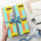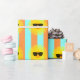 Sun with Dark Sunglasses on Aqua & Orange Stripes personalised wrapping paper features aqua and orange stripes with smiling yellow suns with cool dark shades and long heat rays. Personalise it by adding your own text and/or swapping out the images for your own.