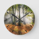 Sunrays in a misty beech forest, golden morning light through the trees on an october day in autumn, Siebengebirge, Rhineland, Germany, Europe. This clock with dial plate is a gift idea for lovers of the outdoors and natural moods. Photo taken by Katho Menden.