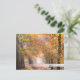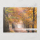 Postcard of rays of light created by sunbeams through the fall foliage of the trees along a path through a forest in the morning fog in autumn with a fading bar and the text: 'Holland'.