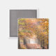 Photo magnet with rays of light created by sunbeams through the fall foliage of the trees along a path through a forest in the morning fog in autumn.