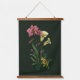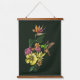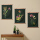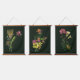 Vibrant tapestry hangings featuring digital paintings of colourful animals and flowers inspired by the flora of South Africa. Each illustration was hand-drawn in pen and ink and then digitally painted. The first panel features a dwarf chameleon in a bouquet of protea; the second panel features a sunbird in a bouquet with a bird of paradise flower or strelitzia and other colourful blooms; and the last panel features a frog sitting peacefully among the lilies. This unique artwork is bold but serene, and would make the perfect addition to an eclectic, boho living room, bathroom or bedroom.
