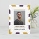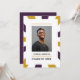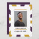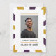 This graduation card announcement features a sunburst background in purple grape, orange and white colours with a room for a vertical photo framed by a white frame.Personalise the card adding your photo, name and year.
