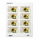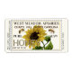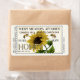 Pale ivory label with a green dotted border and vintage sunflower illustration with bees. Honey is written over the sunflower in large embossed text.