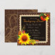 Elegant harvest invitation with sunflowers, wheat, acorns, leaves, mushrooms, berries, and a bird. Set in a chocolate brown background with light brown scroll work.