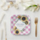 Rustic personalised paper wedding plates for your couples shower, bridal shower, wedding shower or I Do BBQ feature a country design boarder with a watercolor sunflowers and greenery with a pink gingham chequered pattern. Personalise with your names and date. To see more designs like this visit www.zazzle.com/vginvites