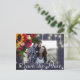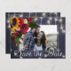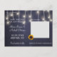 Rustic winter photo wedding save the date postcard with yellow gold sunflowers and dark red burgundy roses bouquet, strings of white twinkle lights and white typography script on a dark midnight navy blue elegant chalkboard. +++++++++ Easy to personalise with your names and text! ++++++++++ Suitable also for floral summer or autumn fall / garden backyard rustic country or farmhouse themed weddings.