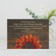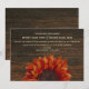 A wedding invitation featuring an image of an orange sunflower peeking from bottom over a background of dark brown barnwood. Personalise the text with details of your occasion.