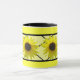 Sunny sunflowers against a black crisscrossed background and black trimmings. A lively coffee mug to help you start your day. For a special gift, include this mug with matching stationery, envelope, and stamp also available for a truly complete stationery gift set.