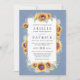 Design features a watercolor slate/periwinkle/dusty or similar shade of blue background with watercolor sunflowers, greenery and more with a printed gold border.