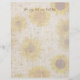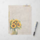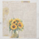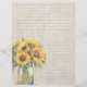 Linen design scrapbook paper with sunflowers. Size 8.5 x 11 inches (2 smaller size options) with designs on both sides and lines on one. A jar full of sunflowers decorates the side with lines. A background pattern of sunflowers covers the other side. The paper has a rustic, linen texture appearance, but is not linen.