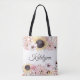 This tote bag features a watercolor style illustration of sunflower bouqut in yellow brown and pink. Your name or other message is spelled in elegant dark brown script lettering. Use the template field to enter your own name or other message.