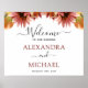 Burgundy and Yellow Sunflower Rustic Outdoor Foliage Watercolor Wedding Welcome Sign Elegant and Modern Invitations on White background - includes beautiful and elegant script typography with modern botanical Fall or Autumn leaves for the special Wedding day celebration.