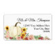 Return address mailing labels for wedding, baby and bridal shower invitations. Perfect for late summer and fall harvest events. Watercolor artwork was created by internationally licensed artist and designer, Audrey Jeanne Roberts. An elegant white pumpkin is surrounded by a bouquet of sunflowers, blush pink roses, and burgundy red blooms. Simple botanical dried foliage in brown earth tones are paired with woodsy, boho style eucalyptus greenery and gathered woodland leaves. Copyright.
