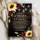 Design features a unique barn wood grain background decorated with floral elements that consists of watercolor garden eucalyptus, greenery, burgundy red roses and sunflowers. Design also features twinkle string lights with country rustic lighted mason jars and a modern text style. View the collection on this page to find matching products.