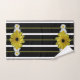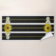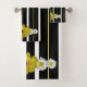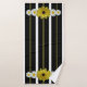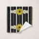 This floral design features a bright, yellow sunflower with daisies on either side. The colourful arrangement is set on a background of black and white bold stripes with a thin, yellow accent stripe.